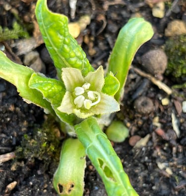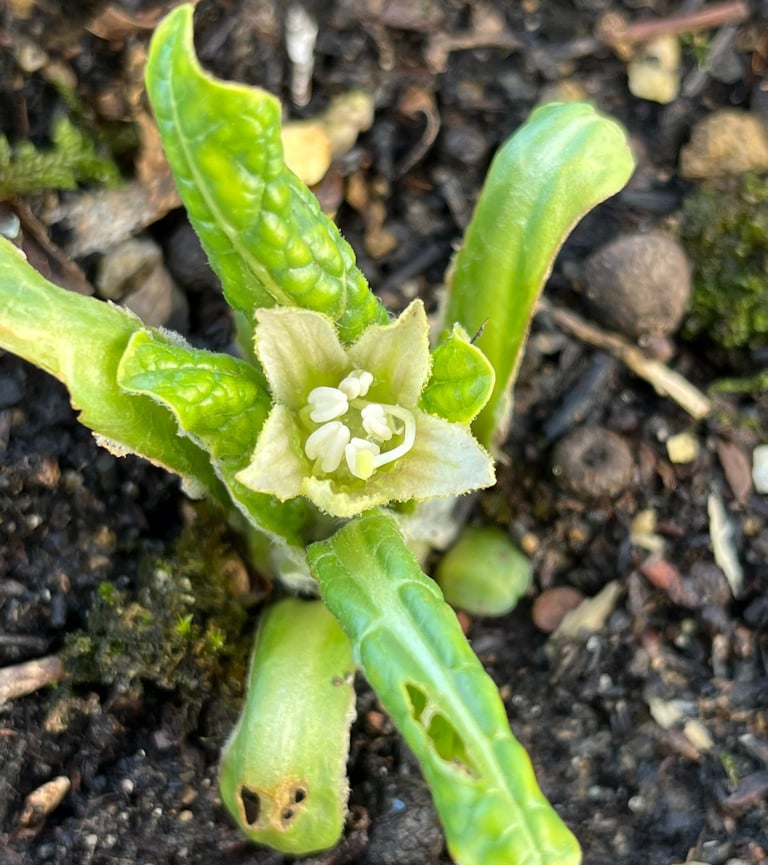 Première fleur de Mandragore officinale pour 2025! D'autres fleurs sortiront entre les vraies feuilles qui vont continuer à pousser également pour donner un aspect plus représentatif de cette plante merveilleuse
